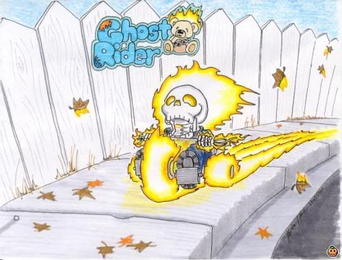 This kid started out with the triaditional upright tricycle. Then I realized that -duh- Ghost Rider would ride a bigwheel! |